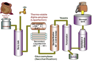 The Ethanol production process has 5 main steps: Grinding (prepare cassava to make suitable for downstream processing); Liquefaction; Saccharification; Fermentation and Distillation. Each of these steps are illustrated and further described below.